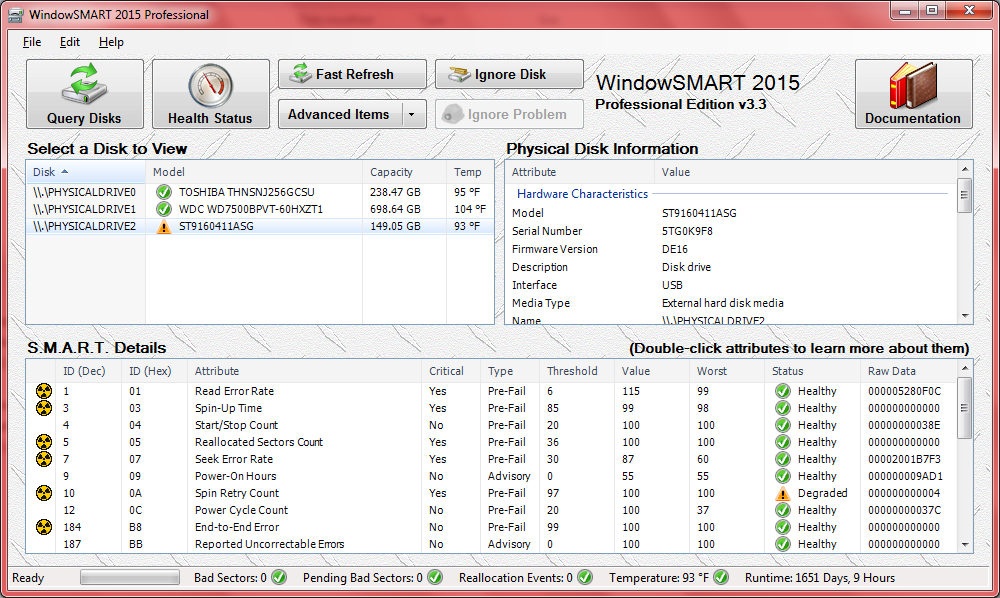 If you want an at-a-glance view of a disk's health status without scrolling through the list of attributes, just click the disk and then click Health Status.