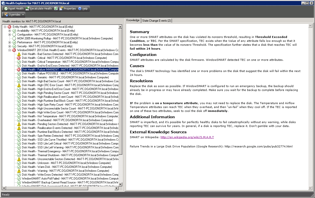 If you run Microsoft SCOM 2007 R2 or later, you can deploy the WindowSMART 2015 management pack to receive disk health alerts in SCOM.